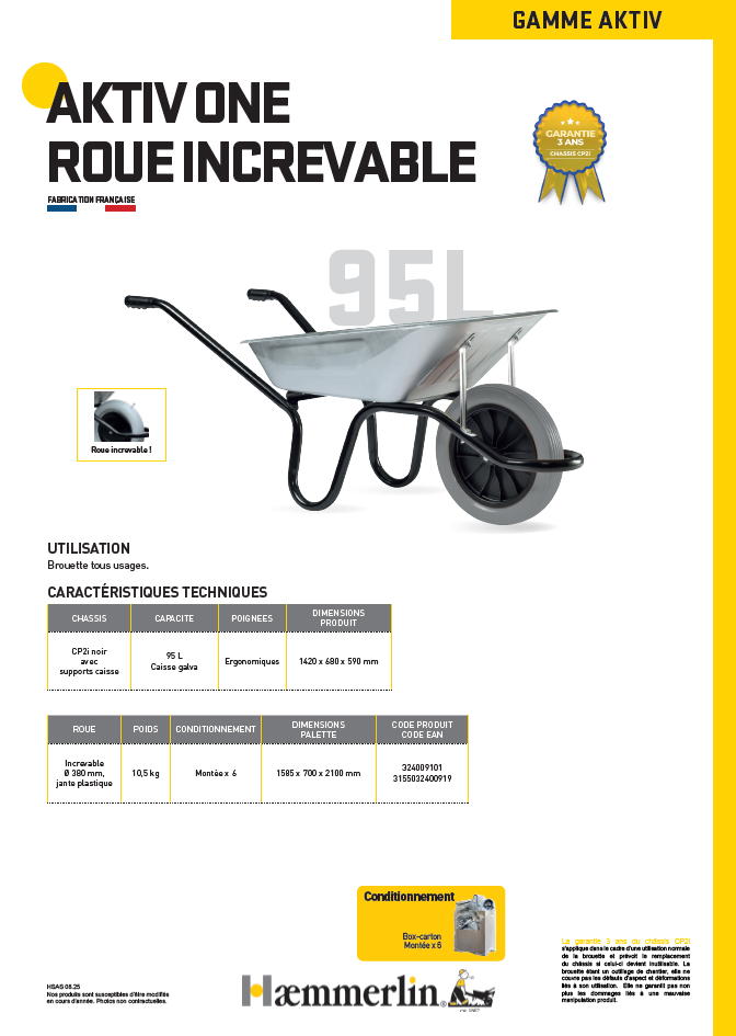 Fabriquée en France, la brouette AKTIV ONE est conçue pour un usage régulier. Son châssis bénéficie d’une garantie 3 ans dans le cadre d’une utilisation normale. Compatible avec des pièces de rechange pour prolonger sa durée de vie.