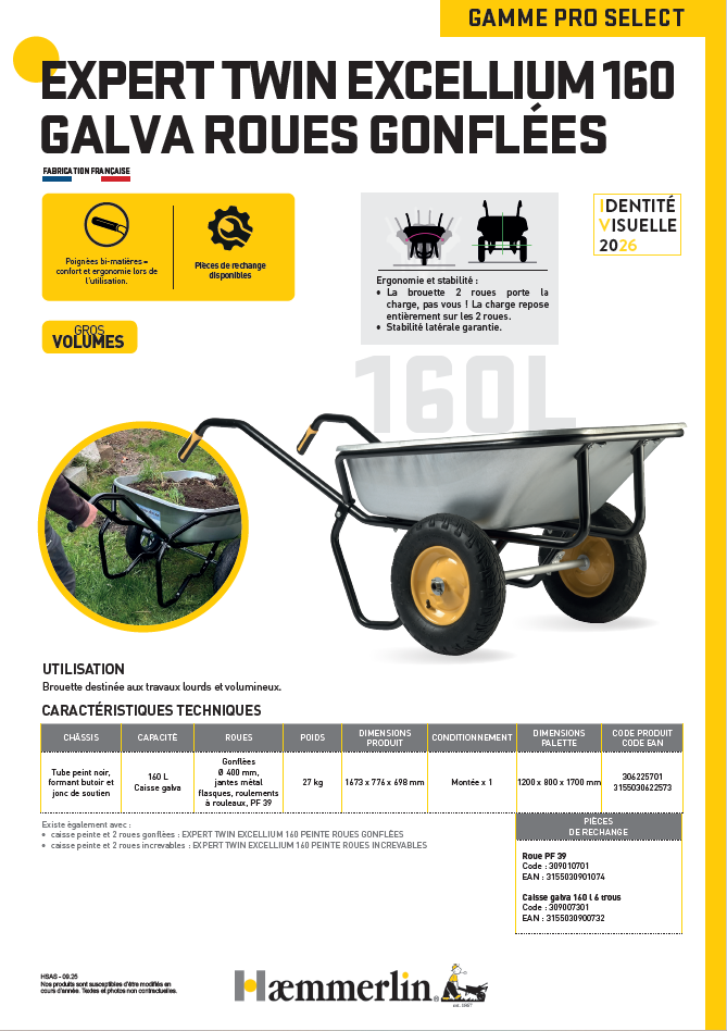 Découvrez la brouette EXPERT TWIN EXCELLIUM 160 Galva Roues Gonflées