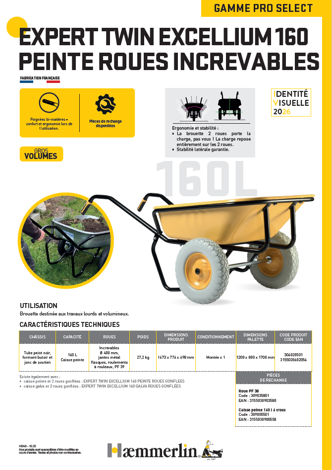 Découvrez la brouette EXPERT TWIN EXCELLIUM 160 Peinte Roues Increvables.