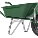 Brouette Cargo Excellium 100 L peinte verte, robuste et confortable, équipée d’une roue gonflée PF 34 et d’un châssis renforcé avec renforts galvanisés.