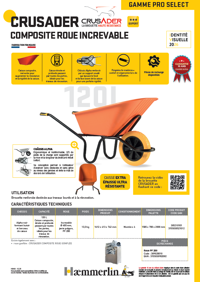 Fabriquée en France, la brouette CRUSADER Composite Roue Increvable est conçue pour un usage régulier et intensif. Son châssis bénéficie d’une garantie 10 ans, et la brouette est compatible avec des pièces de rechange pour prolonger sa durée de vie sur tous types de chantiers.