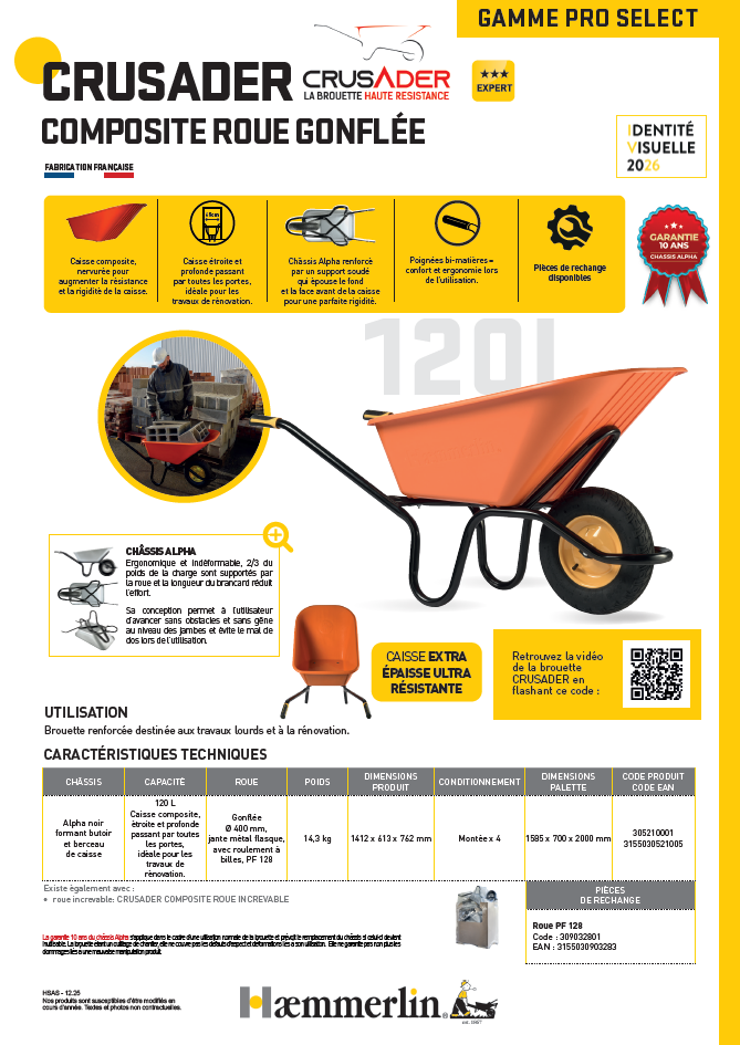 Fabriquée en France, la brouette CRUSADER Composite Roue Gonflée 120 L est conçue pour un usage régulier et intensif. Son châssis bénéficie d’une garantie 10 ans, et elle est compatible avec des pièces de rechange pour prolonger sa durabilité sur tous types de chantiers.