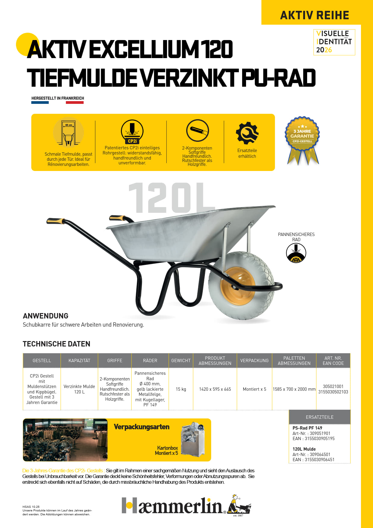 Das ergonomische robuste lackierte Stahlgestell einschließlich des Kippbügels dieser Schubkarre hat sich bei Tausenden von Benutzern weltweit bewährt.Die AKTIV EXCELLIUM 120 verfügt außerdem über ein hochqualitatives kugelgelagertes PU Rad. Mit einer verzinkten (rostgeschützten) 120 Liter schmalen Tiefmulde stellt sie ein optimales Transportgerät von Materialen auf den Baustellen dar.